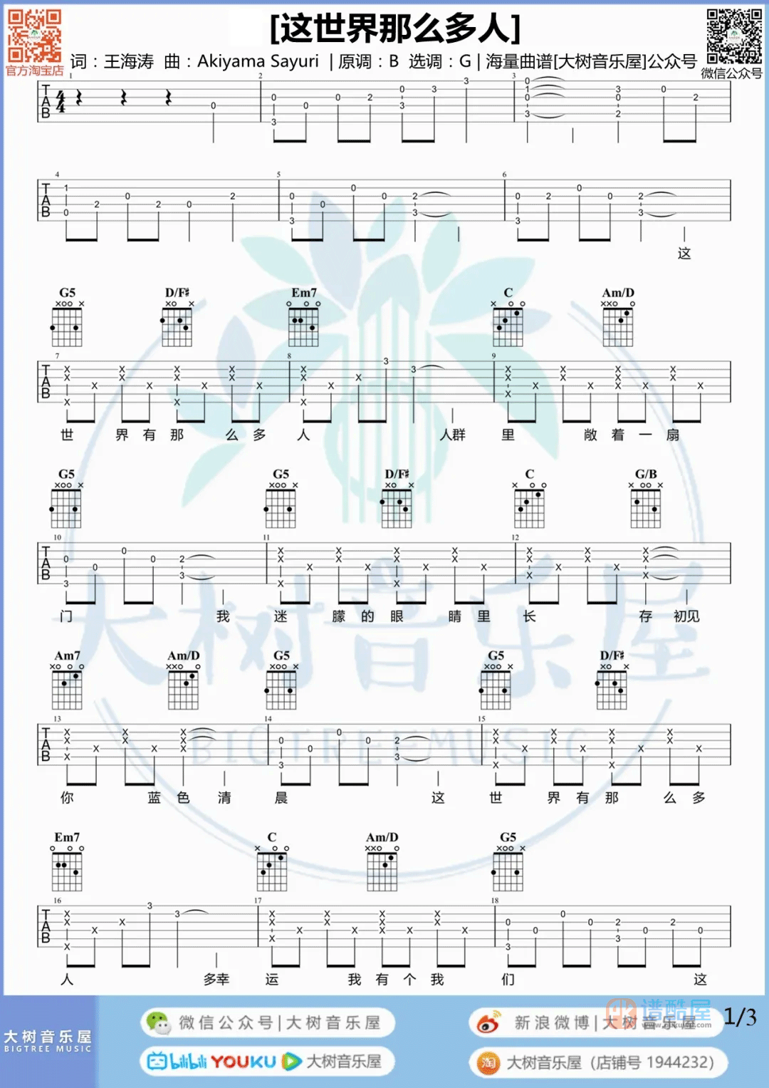 曲谱简介:《这世界那么多人》是莫文蔚演唱的一首歌曲,4/4拍的节奏,这首歌曲的原调为B调,这里曲谱采用了G调指法进行编配,演唱时夹变调夹4品可回到原调,也可根据个人实际嗓音情况选择。曲谱由谱酷屋更新上传,来源于@大树音乐屋编配出品。莫文蔚动情的歌声、细腻的表达,不仅唱出爱而不得的心酸和遗憾,更有对逝去爱情的缅怀和感谢。愿每一对遇见爱的有情人,即使前路狂风暴雨,也能紧紧抓住彼此的手。